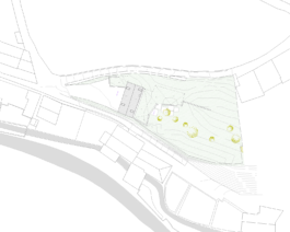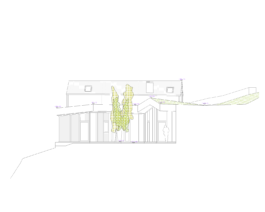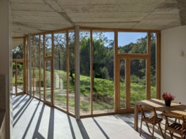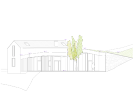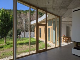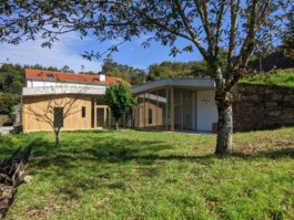 Como resultado, se opta por una pieza semienterrada, situada en la parte trasera de la edificación tradicional, apenas visible desde el exterior de la parcela (desde la parte alta su cubierta vegetal quedará integrada con el entorno natural que la rodea y desde abajo, el talud impide la visión de la parte acristalada de este nuevo elemento) y que se abre completamente a la parcela y las vistas hacia el cauce del río.